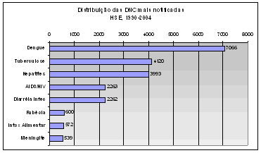 De 1990 a 2004 foram notificados 22.833 casos de doenças de notificação compulsória (DNC) no HSE. O gráfico abaixo ilustra a distribuição das mais freqüentes, ressaltando-se o impacto das epidemias de dengue. Excluindo-se dengue, os agravos mais comuns são tuberculose, hepatites e HIV/Aids. Toda a base de dados de notificação está informatizada; trimestralmente é divulgado um consolidado dos agravos notificados segundo sexo e faixa etária e semestralmente o Boletim Epidemiológico eletrônico pela homepage da instituição. Mais de 90% das notificações são obtidas através da busca ativa.