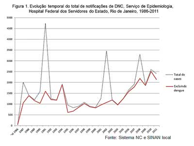 A figura 1 mostra a evolução temporal das notificações, em geral e excluindo os casos de dengue. Excluídas as notificações de dengue, que refletem as várias epidemias ocorridas, identifica-se uma tendência crescente e significativa ao longo do período (r2=0,345), tendência esta significativamente mais acentuada a partir de 2004 e com melhor ajuste do modelo de regressão linear (r2=0,873). Fatores que podem explicar esse aumento são: a maior organização interna do serviço a partir da inserção como Hospital Referência; fortalecimento do quadro de recursos humanos com a aquisição de mais um técnico de nível médio e aumento do número de estagiários de medicina com reforço de três professores sanitaristas; e a incorporação de novos agravos de interesse da V.E..