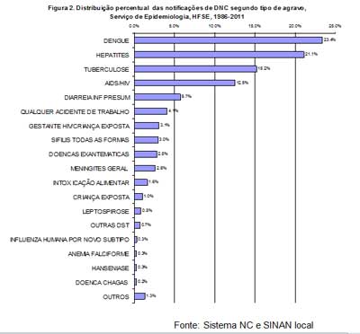 A figura 2 apresenta a distribuição percentual dos agravos. Excluindo-se dengue, os agravos mais comuns são hepatites virais, tuberculose, Aids/H.I.V.+, diarréias e acidentes de trabalho.