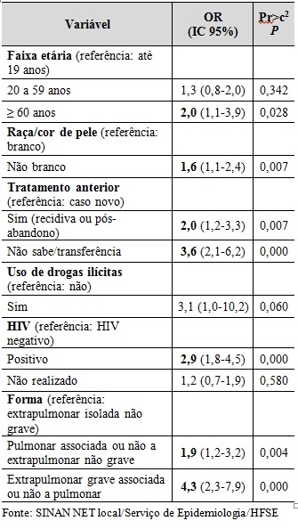 Introdução: A tuberculose (TB) é uma doença infecciosa, negligenciada, endêmica em diversos países e que mata cerca de 1,3 milhões de pessoas a cada ano. É considerada um importante problema de saúde pública global e é um agravo de notificação compulsória em todo o território nacional. Segundo a Organização Mundial da Saúde (OMS), o Brasil se encontra entre os países com maior carga de doença. Em 2014, o estado do Rio de Janeiro apresentou a segunda maior taxa de incidência e a maior taxa de mortalidade por TB no país. Objetivos: Identificar os fatores associados a um desfecho desfavorável (óbito ou abandono) do tratamento da tuberculose em pacientes diagnosticados no HFSE, no período de 2007 a 2014. Metodologia: Estudo observacional, com análise de bases de dados secundárias do HFSE e coleta de dados em prontuários médicos e nas fichas de investigação epidemiológica do Sistema de Informação de Agravos de Notificação (SINAN). Inicialmente foram incluídos todos os casos confirmados laboratorialmente ou clinicamente, com informação de encerramento registrada como cura, óbito por tuberculose e abandono do tratamento. Para fins deste estudo foram considerados desfechos desfavoráveis o óbito por tuberculose e o abandono do tratamento. A análise descritiva inicial foi realizada com o EpiInfo 2000. Executou-se a rotina de revisão de duplicidades e análise de completitude/consistência. As variáveis com razões de chances elevadas na análise bivariada (ainda que sem significância estatística) e aquelas consideradas de importância clínica foram consideradas para inclusão no modelo de regressão logística. A análise estatística foi realizada utilizando-se o software SPSS 18, considerando estatisticamente significativo p<0,005. O projeto foi aprovado pelo Comitê de Ética em Pesquisa do HFSE. Resultados e Discussão: Durante o período estudado foram notificados 1642 casos de TB, sendo selecionados 670 para análise neste estudo: cura = 383 (23,3%); abandono do tratamento = 128 (7,8%); e óbito por TB = 159 (9,7%). As variáveis incluídas no modelo inicial de regressão logística foram faixa etária, raça/cor, história de tratamento prévio para TB, uso de drogas ilícitas, exame anti- HIV e forma clínica/gravidade. O modelo final de regressão logística na tabela 1, com concordância de 69,3%, é apresentado na tabela 1. As situações com associação estatisticamente significativa a um desfecho desfavorável do tratamento para TB (p<0,005) foram idade = 60, raça não branca, história de tratamento prévio para TB ou situação de tratamento prévio desconhecida, anti-HIV positivo e a presença de formas extrapulmonares graves, que incluem a forma miliar, a meningoencefálica e a disseminada.. Tabela 1. Análise de regressão logística múltipla dos fatores associados ao desfecho desfavorável do tratamento da TB em pacientes notificados no HFSE, diagnosticados de 2007 a 2014.